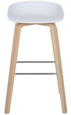 Stilren barstol i ljust format med den vita sitsen i PP plast och underrede i vitpigmenterad och vaxlackad ek. Fotstöd i metall att vila fötterna på, både fram, bak och på sidorna.