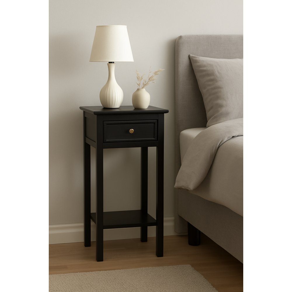 Sängbordet har en praktisk låda samt ett hyllplan, vilket ger dig gott om plats för både böcker, lampor och personliga detaljer. Lådan är perfekt för att förvara mindre föremål som du vill ha nära till hands, medan hyllplanet erbjuder extra utrymme för såväl dekorativa som funktionella objekt. Den antiksvarta finishen ger en stilren och klassisk känsla som passar utmärkt i olika inredningsstilar.
