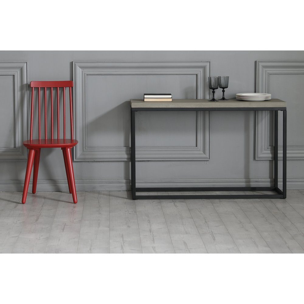Stilrent konsolbord i svart metallstomme med en tjock fibercement topp.