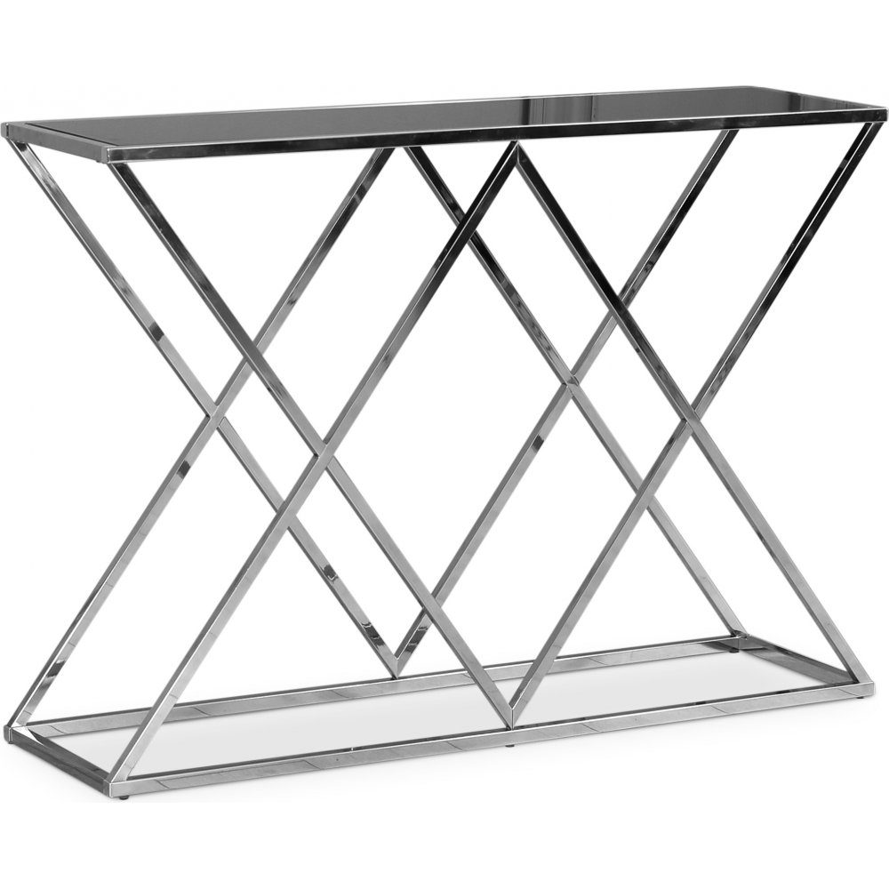 Stilrent konsolbord i kromad metall med toppskiva i mörktonat glas.