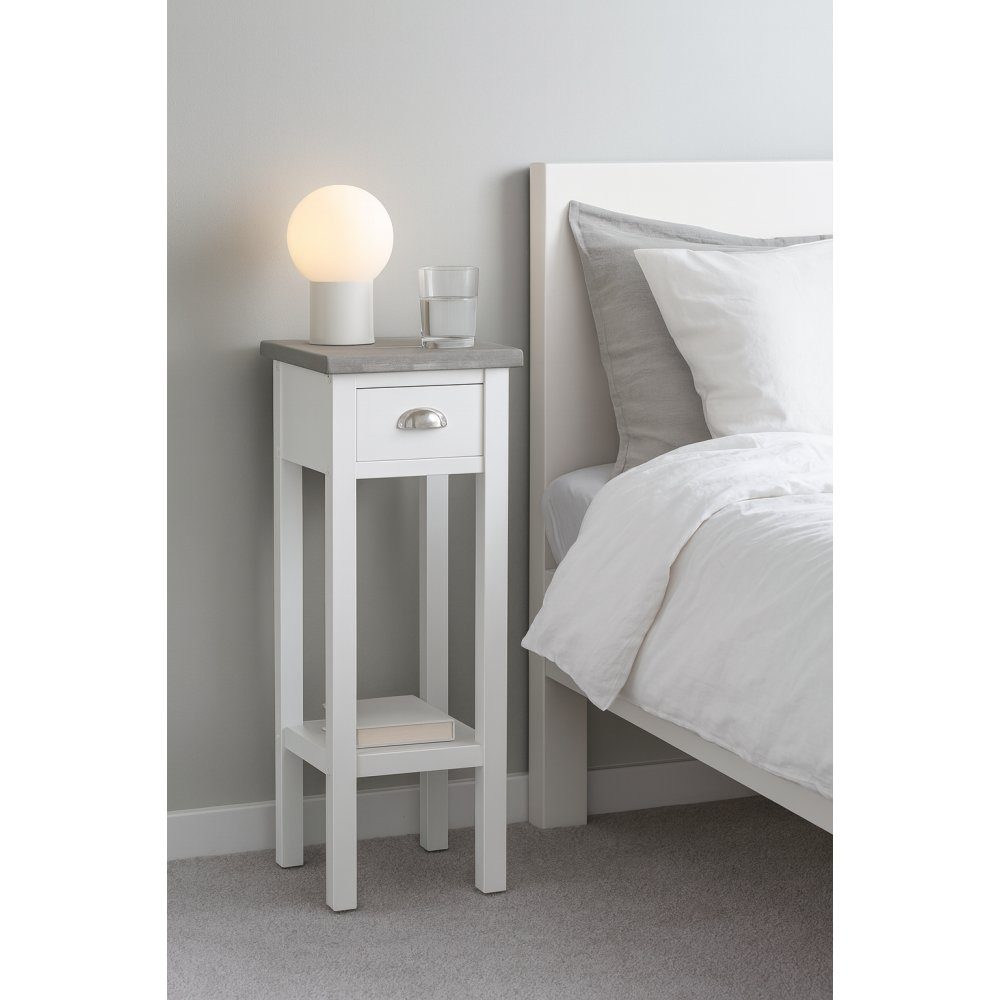 Sängbordet erbjuder praktisk förvaring med en låda, vilket är en perfekt plats för att lägga undan din bok eller andra personliga föremål i.