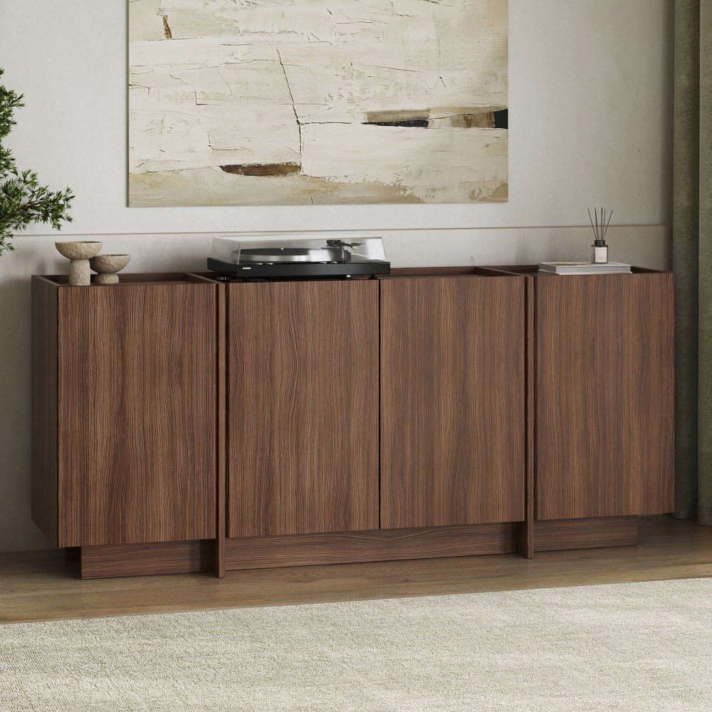 Dromma är ett elegant sideboard med en varm finish i Milano valnöt som ger rummet en sofistikerad och naturlig känsla. Den stilrena designen kombinerar funktionell förvaring med ett modernt uttryck, vilket gör möbeln till ett perfekt inslag i vardagsrum, matsal eller hall.
