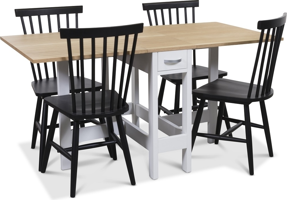 Matgrupp från Skånska Möbelhuset, Klassiskt slagbord Signum med ekfanérad toppskiva och vitlackade ben samt fyra stycken svartlackade Karl pinnstolar som ger ett klassiskt och stilrent intryck!