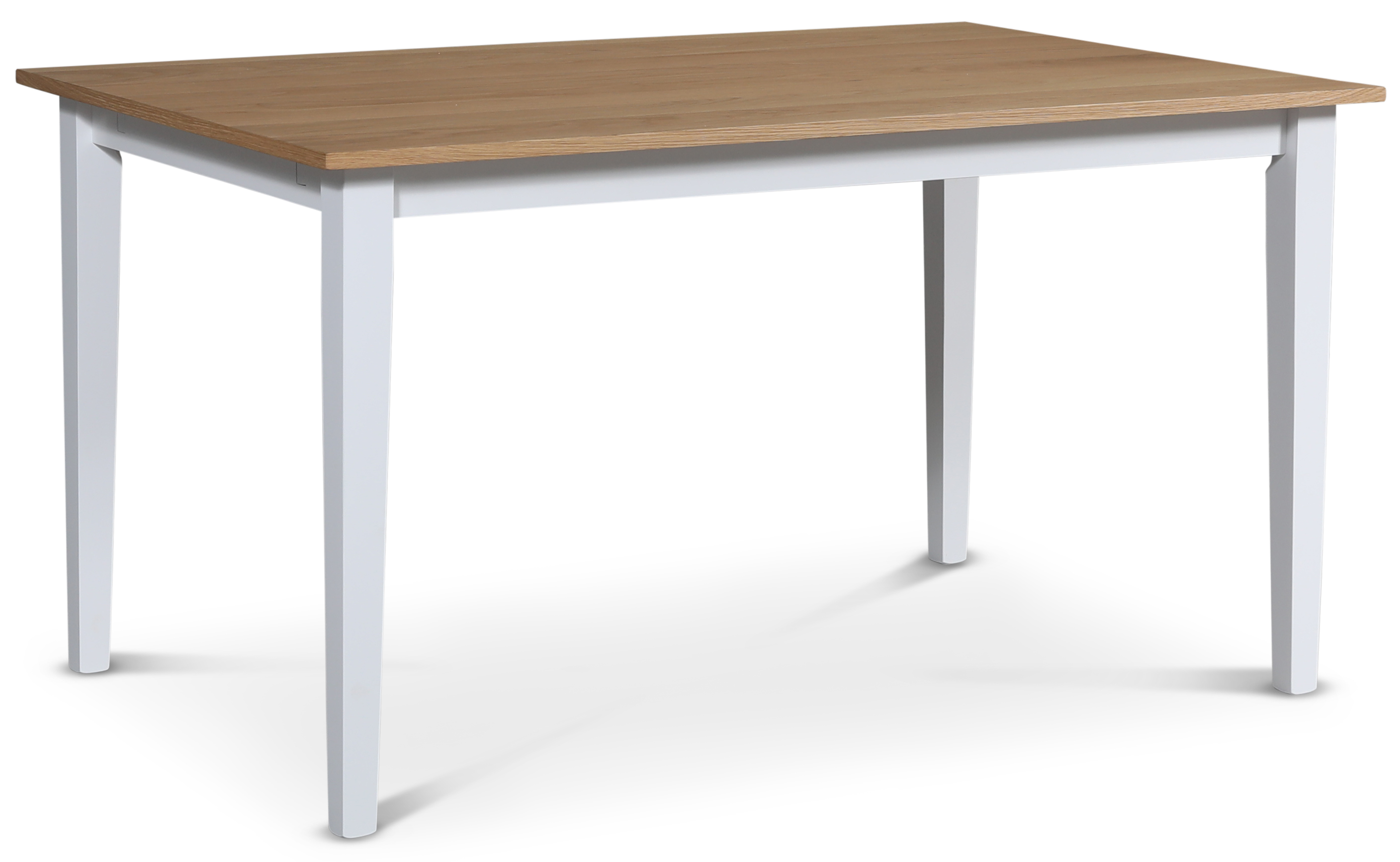 Fårö matgrupp; matbord 140x90 cm - Vit / oljad ek med 4 st Fårö matstolar med ribbor i ryggen, sits i grått tyg