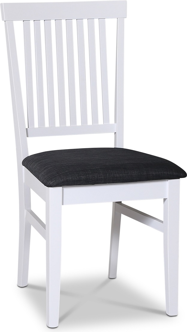 Fårö matgrupp från Skånska Möbelhuset, klassiskt matbord 140x90 cm med vitt underrede och en toppskiva i oljad ekfanèr. Det ingår 4 stycken matchande Fårö matstolar med ribbor i ryggen och sits i grått tyg. Stol i vitlackat trä.