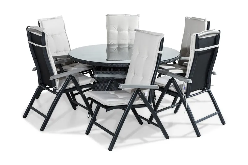 Thor Matgrupp Utomhus Ø140 + 6 Jenny Ställbar Fåtölj m Dyna, Grå/Svart